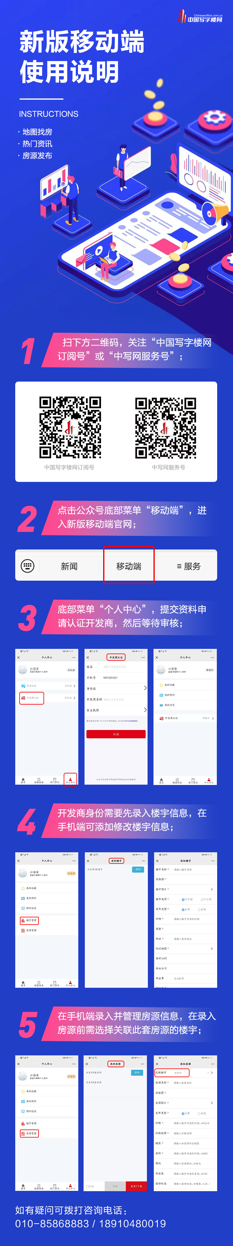 注:扫描上方二维码,注册写字楼网移动端,认证开发商即可免费发布写字楼房源信息,操作说明,如有问题请联系客服:010-85868883